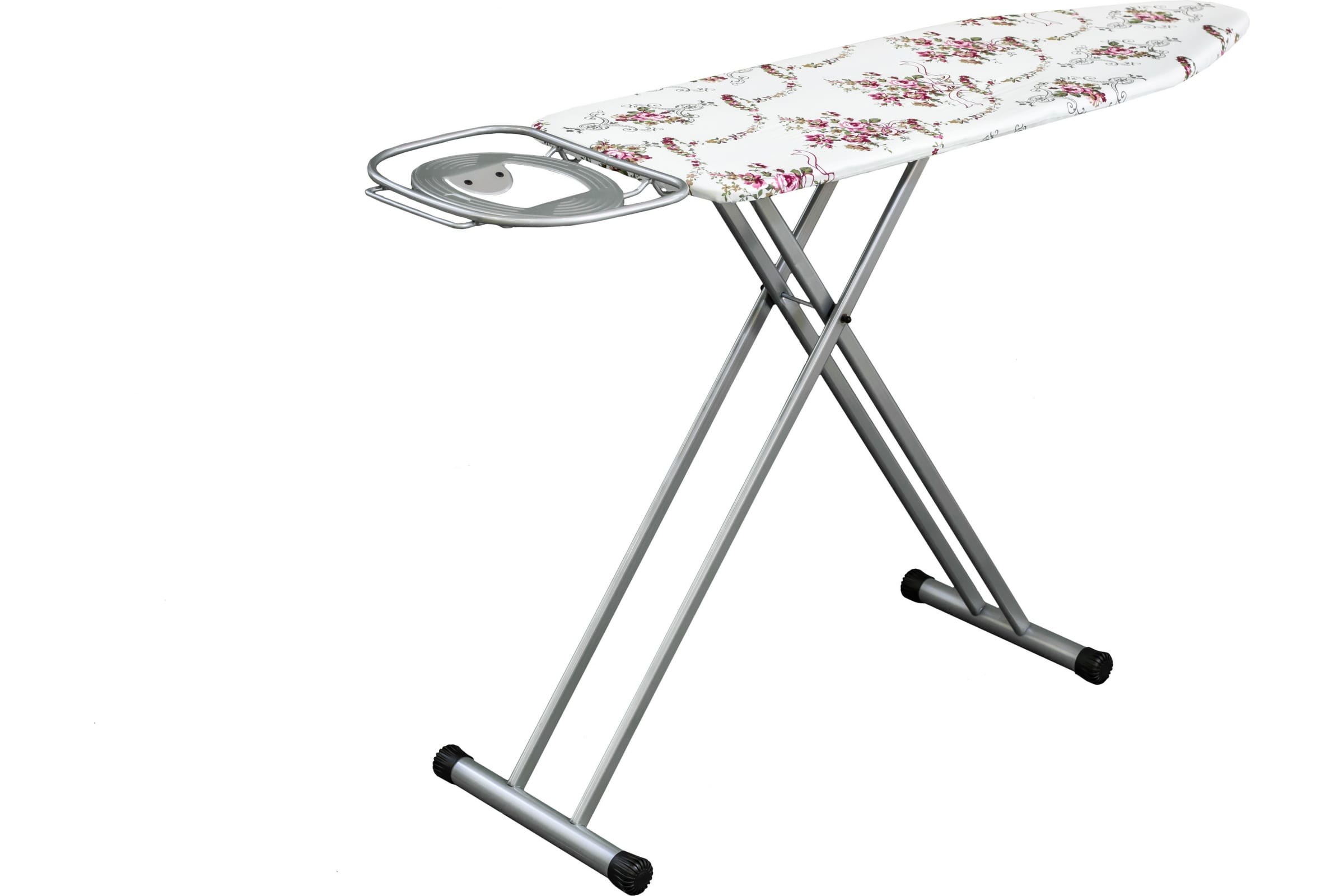 Доска оснащена подставкой для утюга и электроудлинителем. Ножки с накладками препятствуют скольжению и образованию царапин на полу. Гладильная доска легко складывается и не занимает много места.
